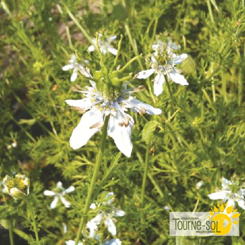 Nigelle cumin noir alias kalonji. Petites fleurs bleues produisant de petites gousses qui sèchent. Pour caris, pains et fromages. +/- 150 semences